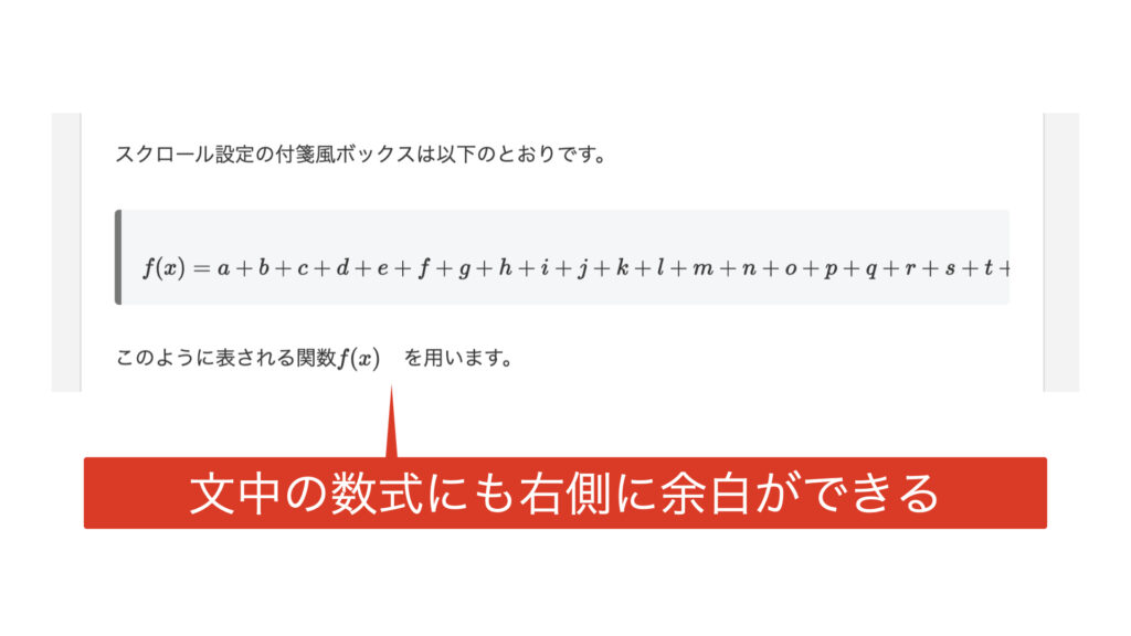 数式の右側に強制的に余白を作るため、以下のような文中で使う数式にも余白が適用されてしまいます。