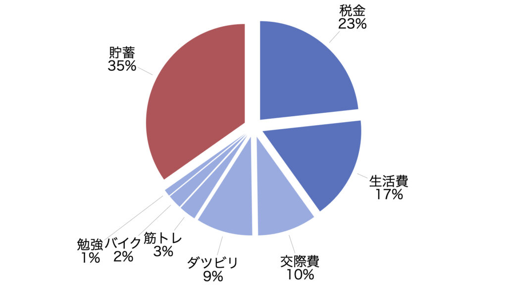 濃い青で示した税金と生活費(家賃、食費、日用品など)は生きるために必須の支出です。